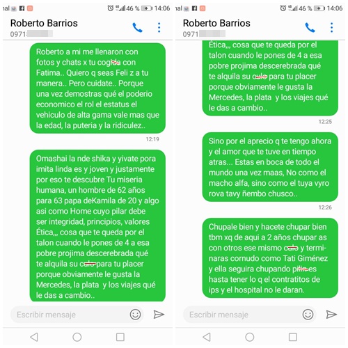 “Roberto a mí me llenaron los chats de tu co**** con Fátima. Quiero que seas feliz a tu manera, pero cuídate porque una vez demostrás que el poderío económico, el rol, el status, el vehículo de alta gama vale más que la edad, a put*** y la ridiculez”, señala el mensaje que luego fue subiendo de tono.