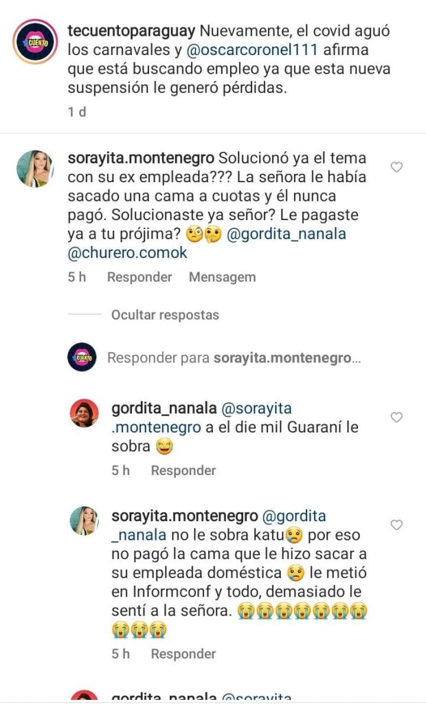 En nuestra página de Instagram, una cuenta denominada “Sorayita Montenegro” entró a opinar bajo la reciente publicación que hicimos del productor Óscar Coronel. En dicho posteo lo acusaron de moroso y de no haber pagado por una cama.