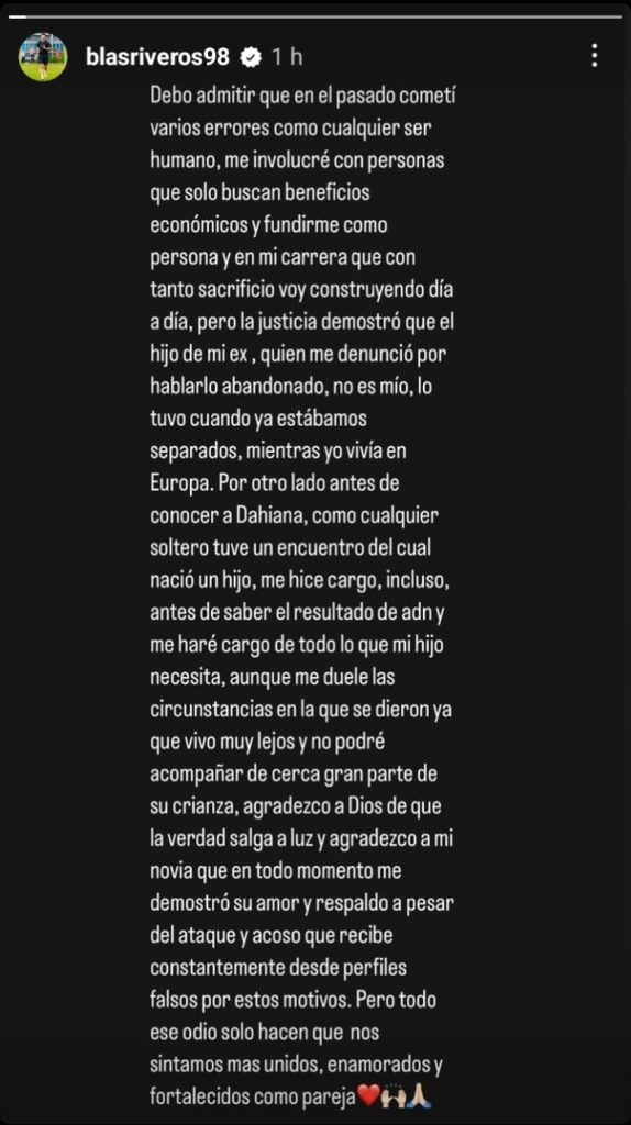En ese mismo contexto, esta mañana, el futbolista Riveros también usó sus redes sociales para dar su versión de la historia, resaltó que no eludió ni eludirá su responsabilidad como padre y así también señaló que hay personas que buscan debilitar su relación con Dahiana y que constantemente la están hostigando mediante perfiles falsos.