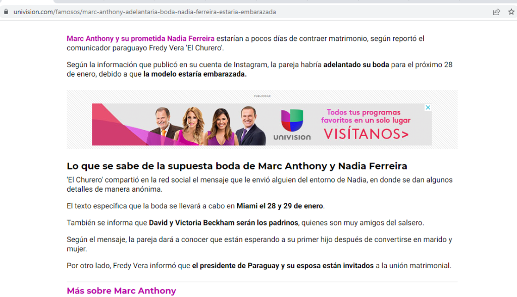 La semana pasada, Fredy Vera filtró un mensaje que recibió en donde le contaban detalles sobre la boda de Nadia Ferreira y Marc Anthony, e incluso se mencionaba a los Beckan como padrinos del enlace.