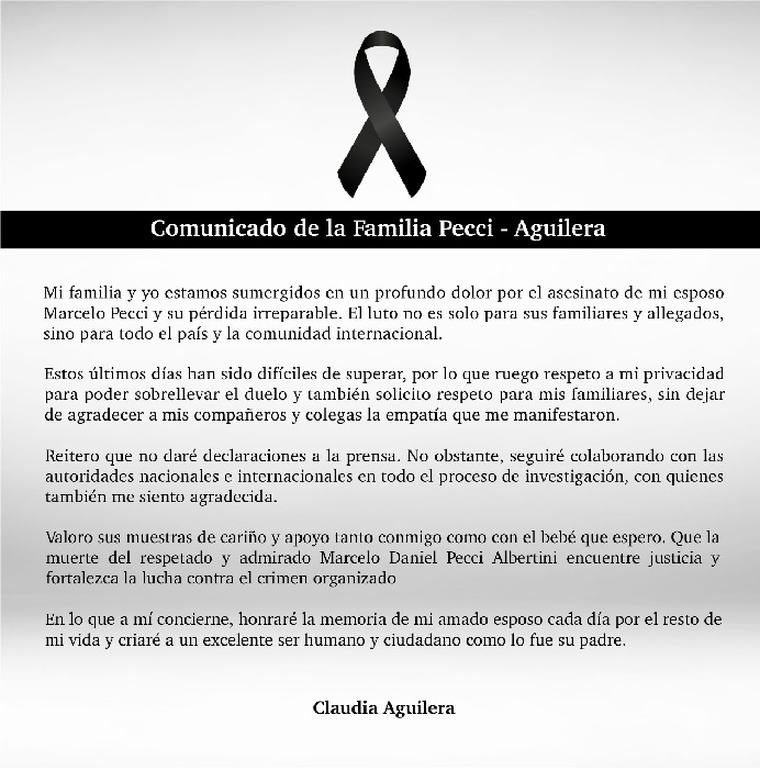 La Periodista, Claudia Aguilera viuda del fiscal Marcelo Pecci, emitió un comunicado tras su llegada al país, solicita respeto a su privacidad y clama por justicia.