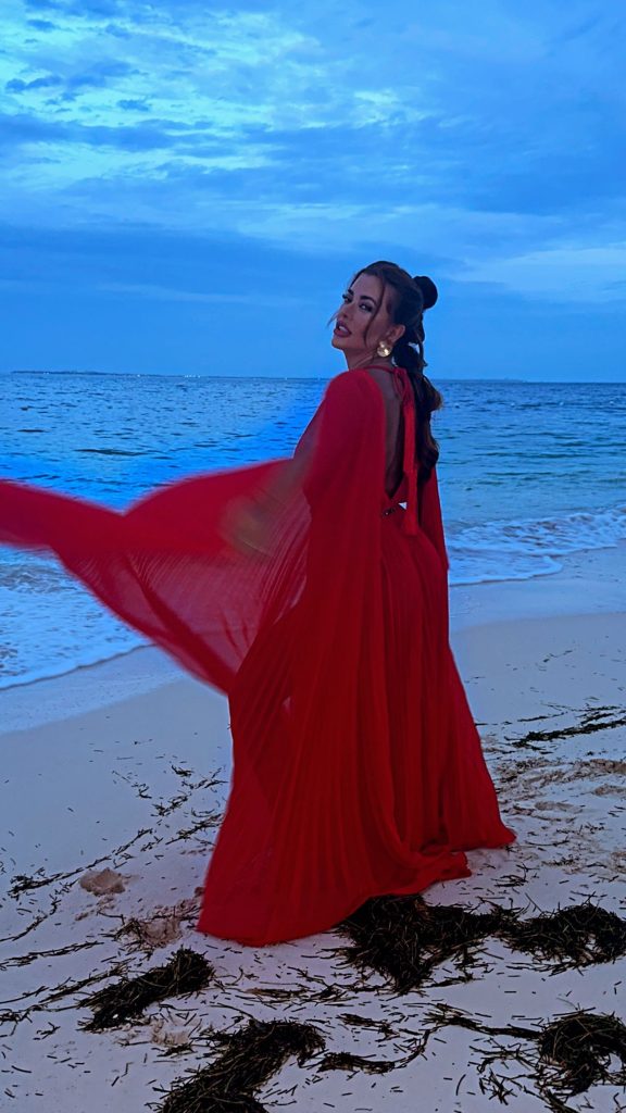 Marly Figueredo fue una de las invitadas a la boda de Carlos Ortellado y Giselle Lesme, la ceremonia se llevó a cabo en Cancún, en un lugar paradisiaco. Para la ocasión, Marly eligió un vestido rojo confeccionado con telas livianas, en estilo greco-romano que se mimetizaba con el paisaje y el viento del lugar, le daba el toque romántico a la prenda en cada vuelo.