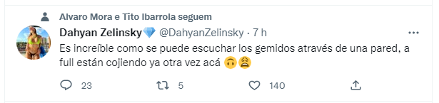 “Es increíble como se puede escuchar los gemidos a través de una pared, a full están co**** ya otra vez acá”, escribió la modelo.