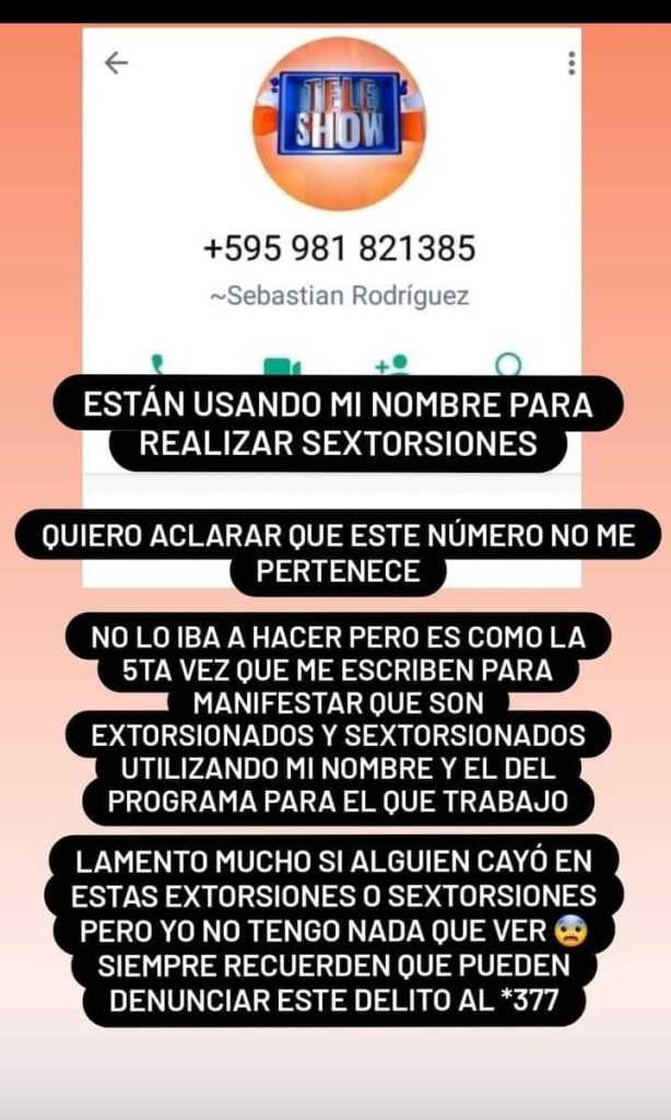 Esta vez, utilizaron el nombre de Sebas Rodríguez y el del programa Teleshow para extorsionar a la gente. Según la publicación que realizó el periodista, es la quinta vez que le avisan que están operando de esta manera.