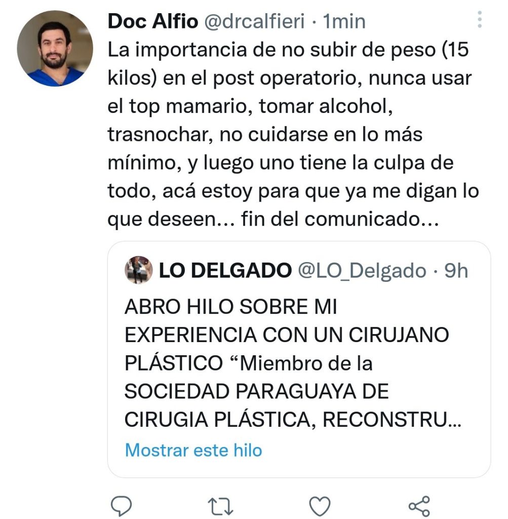 El médico por su parte, emitió una publicación acusando a la paciente de no realizar un buen post operatorio y el día de hoy, volvió al twitter anunciando su salida del país.