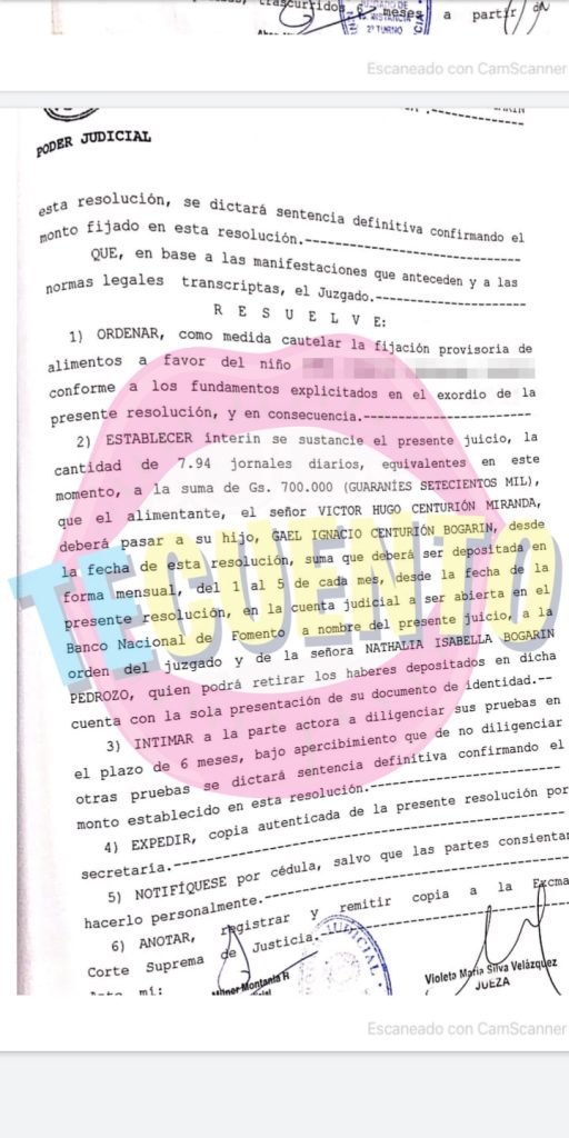 Asimismo, resaltó que ya logró que la justicia asigne provisoriamente el monto de 700 mil guaraníes que Víctor debe abonar para cubrir los gastos de la criatura, sin embargo, ella asegura que el futbolista no está cumpliendo ni con esta resolución.