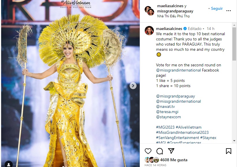 El fin de semana te contábamos que “el sol de Paraguay” brilló en el Miss Grand Internacional, pues nuestra representante, Maelia Salcines, expuso un traje alegórico inspirado en el sol, realizado por las manos de Alfredo Gaona quien ocupó materiales de karanda’y.