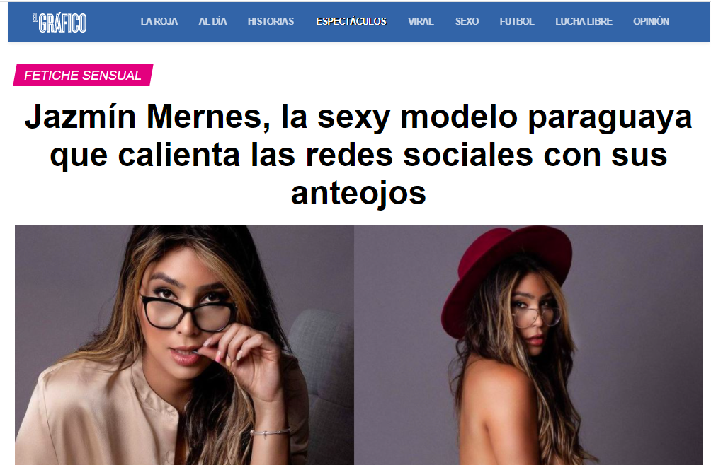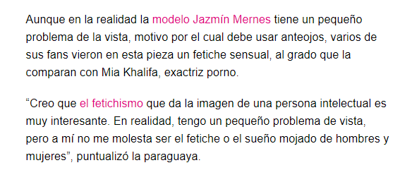 En dicha publicación, resaltaron que Jazmín utiliza lentes para corregir su problema de vista, y que esto provoca que sus fans la comparen con la ex actriz porno, Mía Khalifa, conocida justamente por utilizar lentes como los que usa Mernes.
