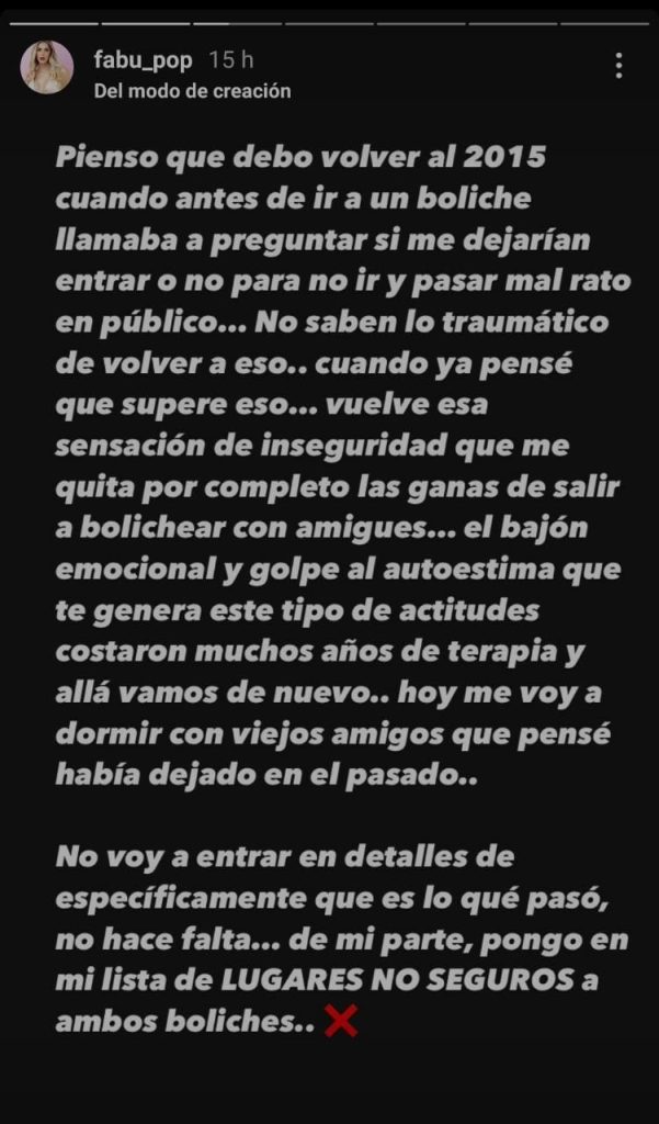Además, agregaba que no pensaba volver al 2015 “cuando antes de ir a un boliche llamaba a preguntar si me dejarían entrar o no para no pasar mal rato en público”