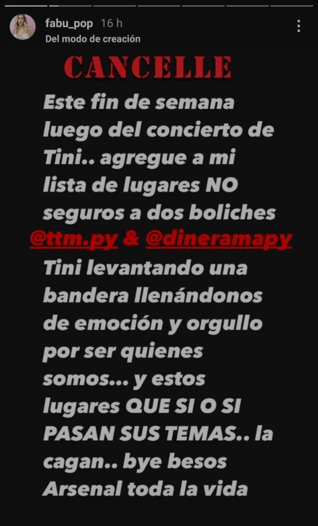 Fabu Pop anunciaba que tiene cancelado a dos boliches mencionaba que “Este fin de semana luego del concierto de Tini… agregue como lugares NO seguros a dos boliches ttm.py & dineramapy, Tini levantando la bandera llenándonos de orgullo por quienes somos… y estos lugares QUE SI O SI PASAN SUS TEMAS… la cagan… bye besos Arsenal toda la vida”