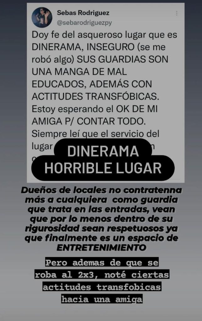 A esta denuncia se sumaba el conductor de tv Sebas Rodríguez quien también salió al paso de las declaraciones de Fabu y reforzaba la denuncia hecha por la cantante y actriz afirmando “Doy fe del asqueroso lugar que es DINERAMA, INSEGURO (se me robo algo) SUS GUARDIAS SON UNA MANGA DE MAL EDUCADOS, ADEMAS CON ACTITUDES TRANSFÓBICAS.”