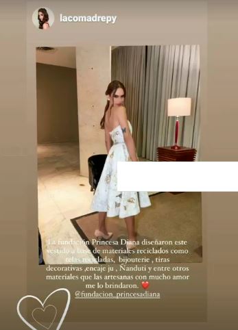 La influencer publico en su cuenta oficial de instagram que la Fundación Princesa Diana le regalo un vestido confeccionado por las artesanas, la prenda, se realizó con telas recicladas, bijouteri, tiras decorativas, encaje ju, ñanduti, y entre otros materiales reciclados.