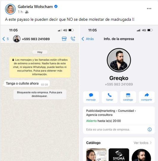 Gabi recibió un mensaje de un sujeto en su whatsapp preguntándole qué tipo de ropa interior estaba usando en ese momento. La modelo aseguró que recibió este mensaje por la madrugada y no dudó en bloquearlo y exponerlo en sus redes.