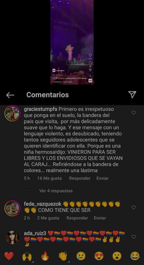 En su comentario mencionaba “Primero es irrespetuoso que ponga en el suelo, la bandera del país que visita, por más delicadamente suave que lo haga. Y ese mensaje con lenguaje violento, es desubicado teniendo tantos seguidores adolescentes que se quieren identificar con ella. Porque es una niña hermosa! Dijo VINIERON PARA SER LIBRESY LOS ENVIDIOSOS QUE SE VAYAN AL CARAJ… Refiriéndose a la bandera de colores…realmente una lástima”