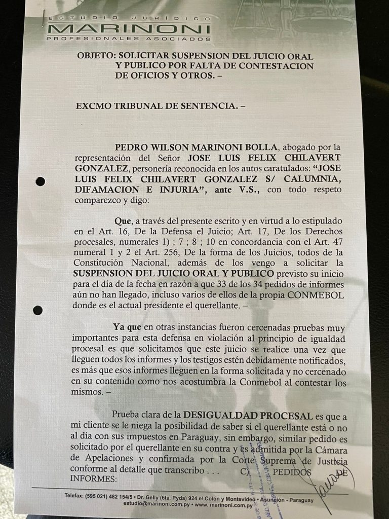 Sin embargo, el abogado Pedro Wilson Marinoni, defensor de Chilavert, solicitó la suspensión del juicio alegando que la Conmebol no ha enviado informes que forman parte de las pruebas a favor de su defendido.