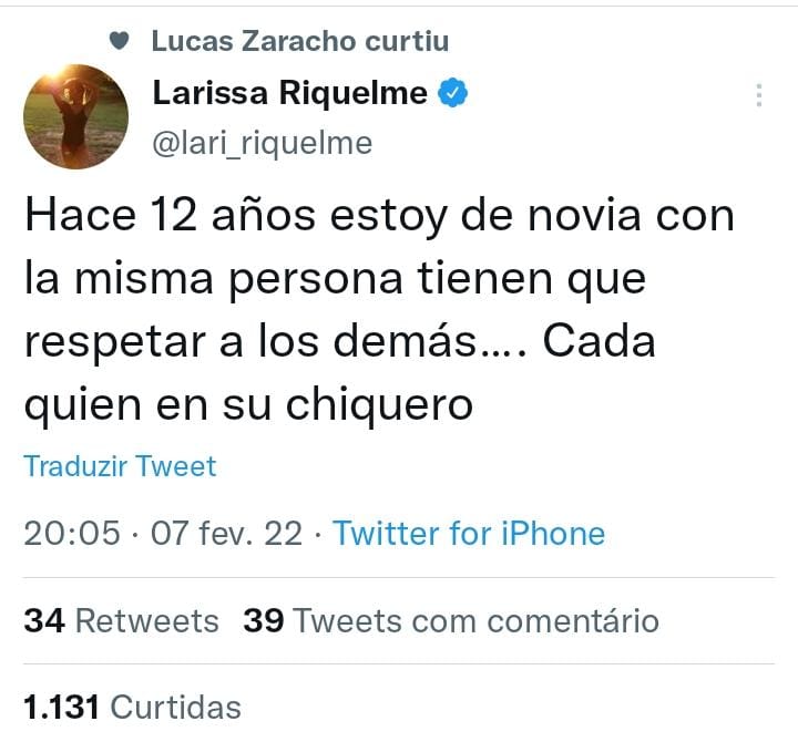 A través de su cuenta en Twitter, la eterna novia del mundial, Larissa Riquelme, pidió a sus seguidores que respeten su relación ya que lleva 12 años con la misma persona. Esto, en consecuencia a los rumores que los internautas esparcieron asegurando que Riquelme está con un nuevo amor.