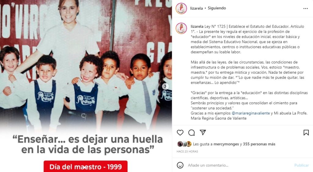 Había sido, allá por 1999, Lizarella se desempeñó como maestra. Ella nos contó que es profesora superior de Danza Paraguaya, y además, es psicopedagoga, por eso siempre estuvo ligada a la educación.