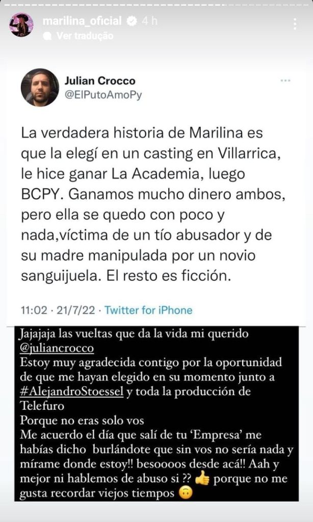 “La verdadera historia de Marilina es que la elegí en un casting en Villarrica, le hice ganar La Academia, luego BCPY. Ganamos mucho dinero ambos, pero ella se quedó con poco y nada, víctima de un tío abusador y de su madre manipulada por un novio sanguijuela, lo demás es ficción”, disparó Crocco.
