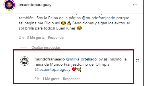 “Yo no estoy en guerra con nadie aclare y vuelvo a aclarar una y mil veces no tengo ni pretendo entrar en guerra con nadie. Otra cosa, la página que me nominó reina de su página. Para dejar en claro también, soy la Reina de la página Mundo Franjeado porque tal página me eligió así. Bendiciones y sigan los éxitos, el sol brilla para todos”, afirmó Ortellado.