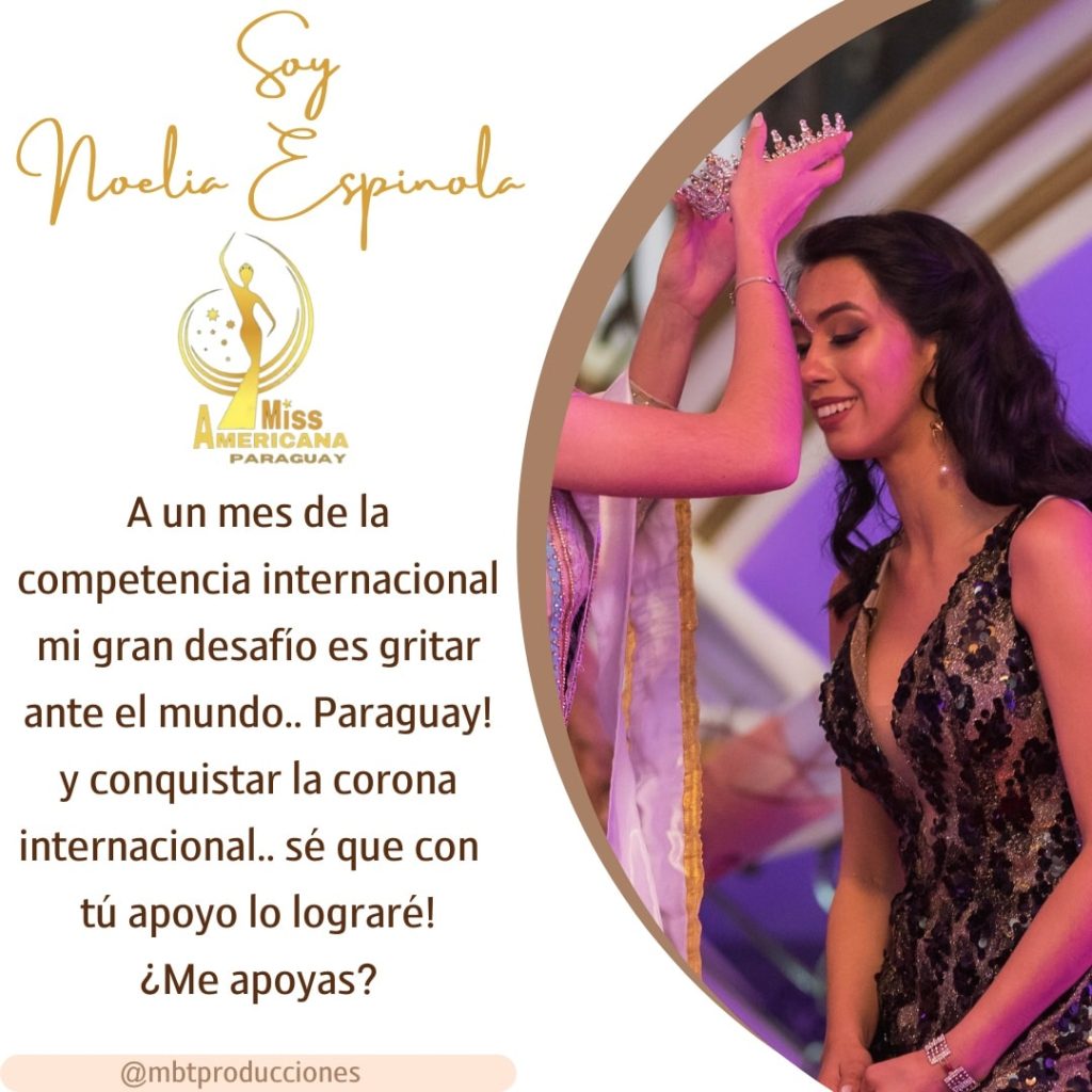 A un mes de llevarse a cabo en su primera edición el concurso de belleza “Miss América Internacional 2022”, que busca coronar a la mujer con belleza integral y propósitos en causas sociales, nuestra compatriota Noelia Espínola se encuentra preparándose para representarnos en dicho certamen y dejar en alto el nombre de Paraguay ante el mundo.