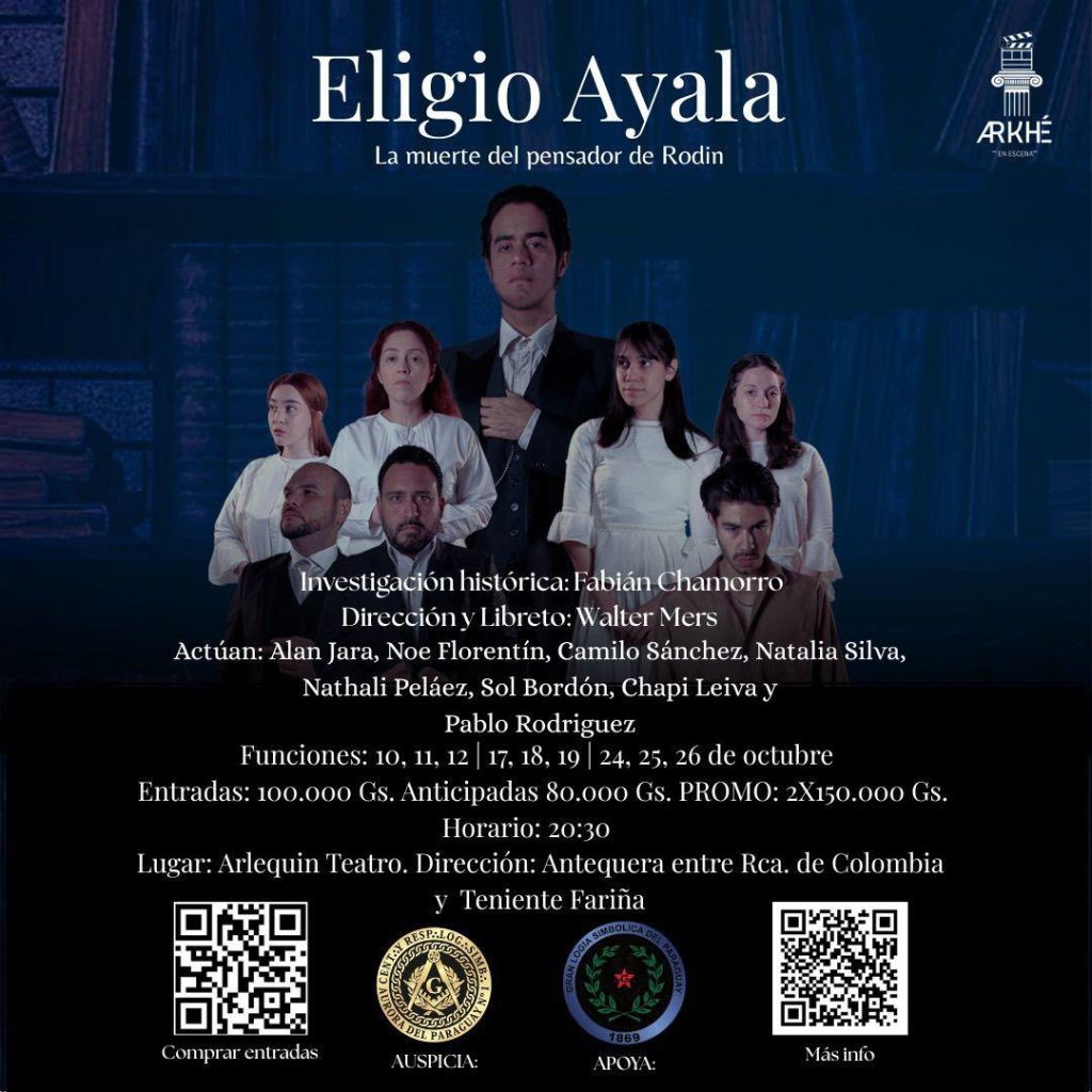 ELIGIO AYALA. LA MUERTE DEL PENSADOR DE RODIN: A pedido del publico regresa este fin de semana esta propuesta escrita y dirigida por Walter Mers con investigación histórica realizada por Fabián Chamorro, y las actuaciones de Alan Jara, Noe Florentín, Camilo Sánchez, Natalia Silva, Nathali Peláez, Sol Bordón, Chapi Leiva y Pablo Rodríguez. Ambientada en los años 30, esta obra retrata la vida del líder paraguayo atrapado entre el poder, el deber y sus pasiones ocultas. A través de una trama cargada de intrigas, emociones y traiciones, muestra el conflicto entre lo público y lo íntimo, revelando cómo los secretos pueden alterar el destino de un hombre y de una nación. Las funciones serán de viernes a domingo a las 20.30Hs, en En Sala La Correa (Prof. Dr. Luis Alberto Garcete y Don Bosco) Las entradas tienen un valor de Gs. 1000.000 en días de función y cuenta con promo de entradas anticipadas a Gs. 80.000 o 2 x Gs.150.000.