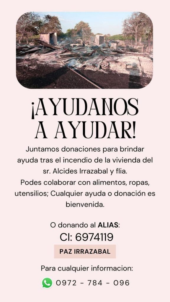 El fin de semana pasado, la familia Irrazábal habitante de la comunidad Cadete Pando- Chaco, sufrió un incendio de gran magnitud que les dejó sin casa.