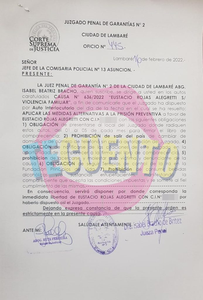 Tacho Rojas tiene prohibido salir del país, debe presentarse al juzgado el 5 de cada mes, debe seguir terapia para controlar su ira, y además, se le prohíbe acercarse a la supuesta víctima y consumir bebidas alcohólicas y sustancias estupefacientes, según señala la resolución de la jueza penal de garantías.