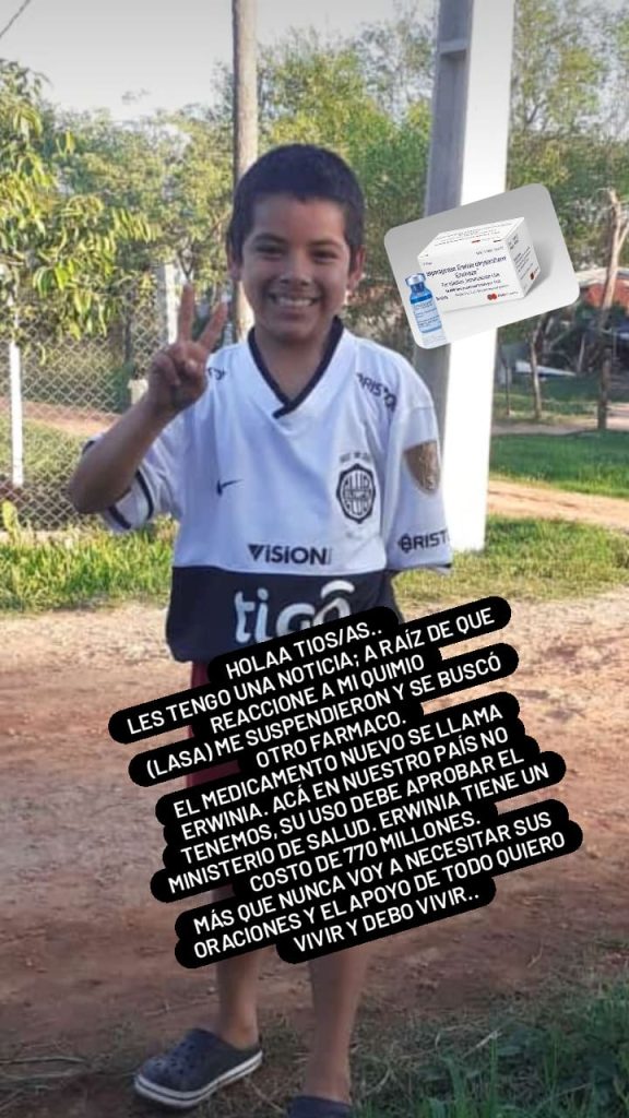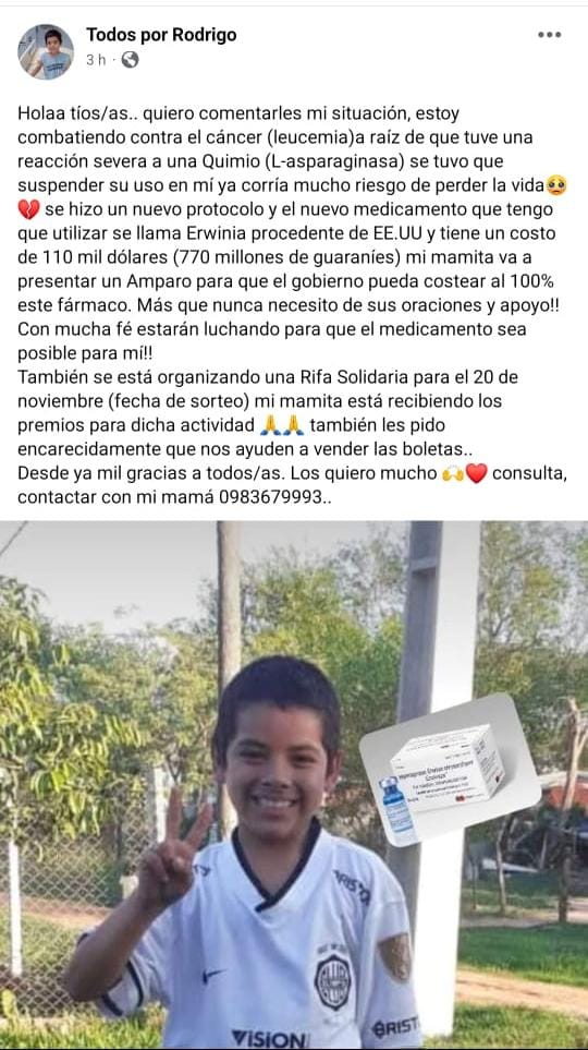 Rodrigo reaccionó a la quimioterapia y por esta razón los médicos le recetaron otro fármaco de nombre Erwinia que casualmente, no tenemos en nuestro país y para traerlo del extranjero y poder utilizarlo en Paraguay se necesita la aprobación del Ministerio de Salud. El medicamento tiene un costo de 770 millones de guaraníes y es por eso que apelan a la ciudadanía para lograr reunir este monto.
