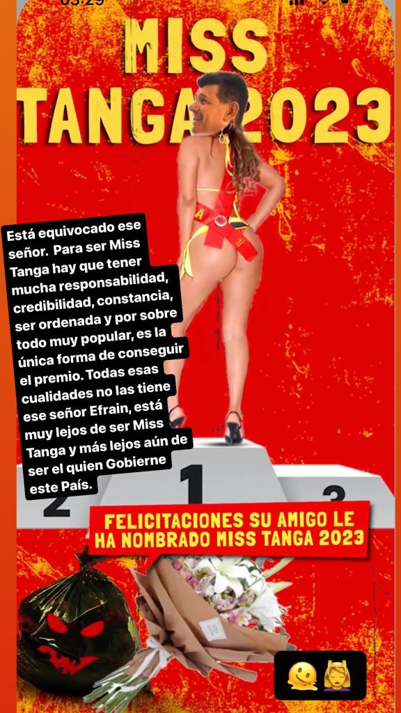 El material llegó a manos de la actual Miss Tanga, Sabrina Sánchez, quien no dudó en defender su corona, en ese contexto, la modelo dijo que “para ser Miss Tanga hay que tener responsabilidad y credibilidad” cualidades que según ella, Efraín no posee.