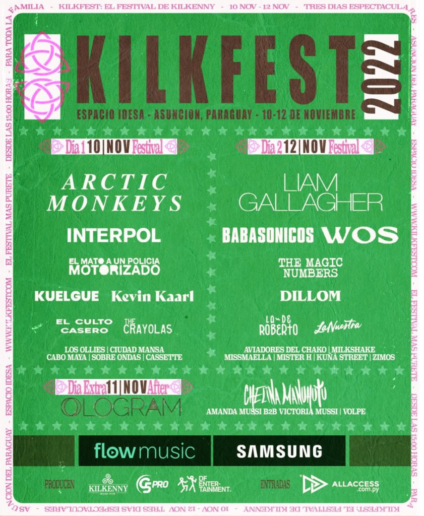 El lineup de la edición 2022 de KILKFEST se encuentra encabezado por la exitosa banda británica de rock ARCTIC MONKEYS que regresa a nuestro país después de 3 años y por el consagrado artista inglés; LIAM GALLAGHER por primera vez en Paraguay, conocido por haber sido vocalista de Oasis y de Beady Eye, así también como INTERPOL, banda de post punk estadounidense que vuelve a pisar suelo paraguayo y BABASONICOS de Argentina en el marco de su tour denominado BYE BYE. Se destaca también la presencia de grandes figuras actuales: WOS, KEVIN KAARL y DILLOM. También retornan al país: THE MAGIC NUMBERS, KUELGUE y EL MATO A UN POLICÍA MOTORIZADO, bandas muy queridas por el público paraguayo desde sus últimas presentaciones. Completan el cartel referentes y emergentes de la escena local como: LA DE ROBERTO, LANUESTRA, EL CULTO CASERO, THE CRAYOLAS, LOS OLLIES, CIUDAD MANSA, AVIADORES DEL CHAKO, MILKSHAKE, MISSMAELLA, CABO MAYA, SOBRE ONDAS, MISTER H, CASSETTE, KUÑA STREET y ZIMOS.