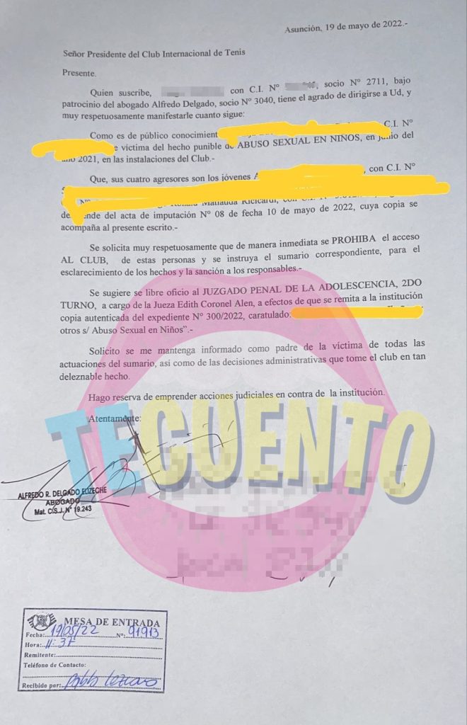 “Se solicita muy respetuosamente que de manera inmediata se prohíba el acceso al club de estas personas y se instruya sumario correspondiente para el esclarecimiento de los hechos y la sanción a los responsables”, señala una parte de la misiva que lleva la firma del denunciante y de su abogado.