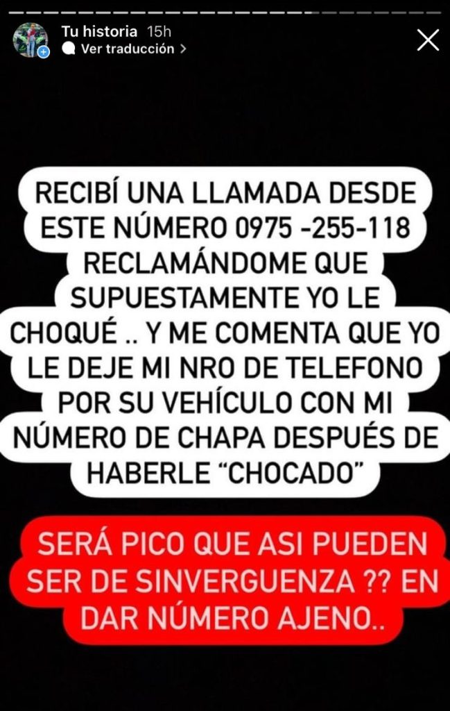 “Yo recibí la llamada cuando estaba llegando a mi casa y me dice el muchacho que yo le choqué y que le dejé una nota con mi número de teléfono y de mi chapa, y yo en ningún momento choqué por eso le pregunté bien. El tipo me preguntó si tenía seguro y que iba a dejar la denuncia de que supuestamente yo le choqué”, resaltó.