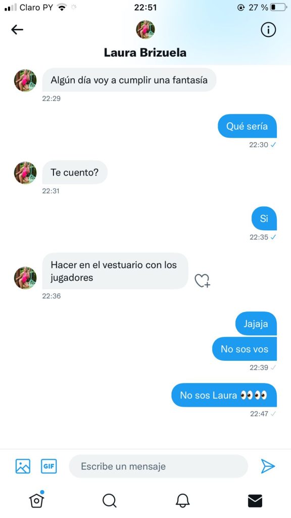 Ella nos contó que un amigo suyo se percató de la presencia del perfil y pensando que era ella, le escribió al privado, sin embargo, al intercambiar los mensajes se dio cuenta de que no era Laura.