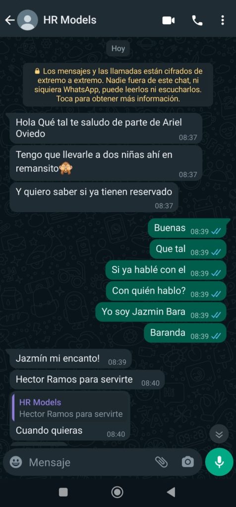 “Se comunicó una persona vía whatsApp haciéndose pasar por César Ariel Oviedo Ministro del Ambiente y pidió alquilar mi local Jardines de Remansito para pasar tres días con unas señoritas, también pidió whisky y en ese momento le dije que ya que son varios días podía hacerle un descuento, y me dijo que no hacía falta y que se comunicaría conmigo Héctor Ramos que estaría llevando las señoritas”, resaltó.