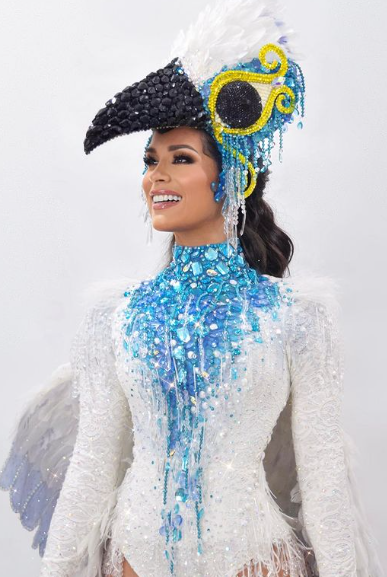 Ayer, nuestra Miss se presentó en el desfile de trajes alegóricos luciendo un atuendo inspirado en el Guyra Campana que fue elaborado por Hugo Vera y Néstor Robelli.